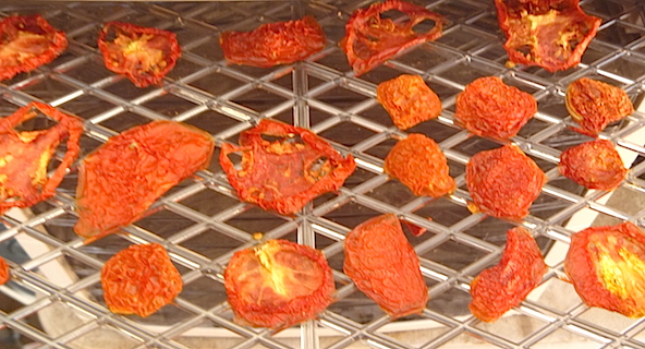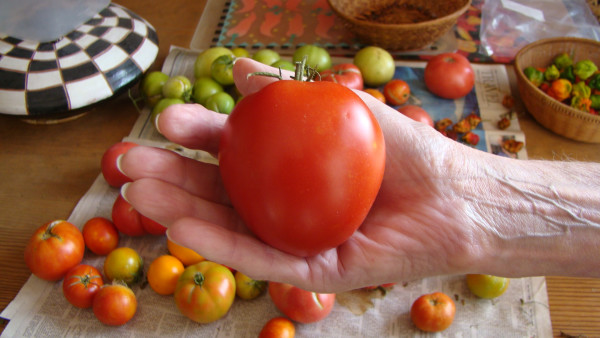 Well, it wasn’t my largest tomato harvest ever, but it was probably in third place at 80.75 pounds. When I was seriously microfarming in 2013, I harvested the all-time record at 302 pounds. This year because of our spring travels, I was a month late in planting, so I’m pleased with the yield. We now have frozen tomatoes, tomato sauces, and a couple of quarts of dried tomatoes. Here are some garden and harvesting shots. Above, our dining room table was turned into a ripening table.