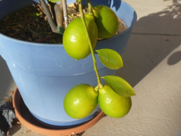 Finally, finally, my Meyer lemons are starting to ripen. My potted tree is about 5 1/2 feet tall and it has 11 lemons on it, which isn’t bad for a small tree. But it’s been more than nine months since the tree started setting fruit. I’m more accustomed to two or three months for tomatoes and peppers, so it’s been a very long wait. Orange growers in Florida wait 12 months for their trees’ fruit to ripe, so I guess I shouldn’t whine and moan about it. These particular lemons go back in time to a Chinese hybrid of a regular lemon and a Mandarin orange tree, so they’re munch sweeter than most lemons. So, what am I going to do with these lemons? I still have my mom’s recipe for lemon meringue pie, so that’s definitely on the to-make list. Lemon sorbet or granita? Why not. Whiskey sour? That’s a waste of this type of lemon. Meyer Lemon Cake, that would work. And definitely, Meyer Lemon Roasted Chicken with Herbs. Here are the oldest lemons with just a slight yellowing. Two weeks longer?  Aarrgh!