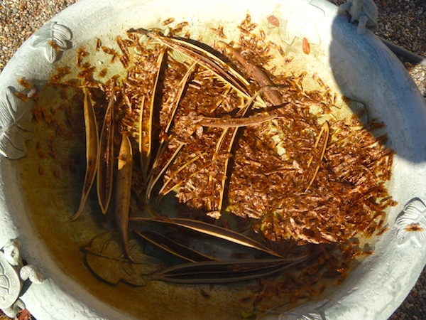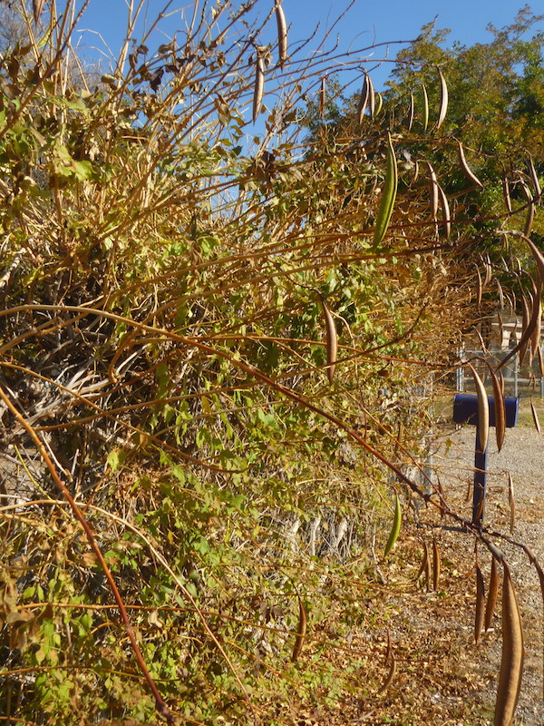Above, here’s what my trumpet vine looks like during the summer. Hummingbirds pollinate these flowers with their long tongues, and soon the seed pods start forming.