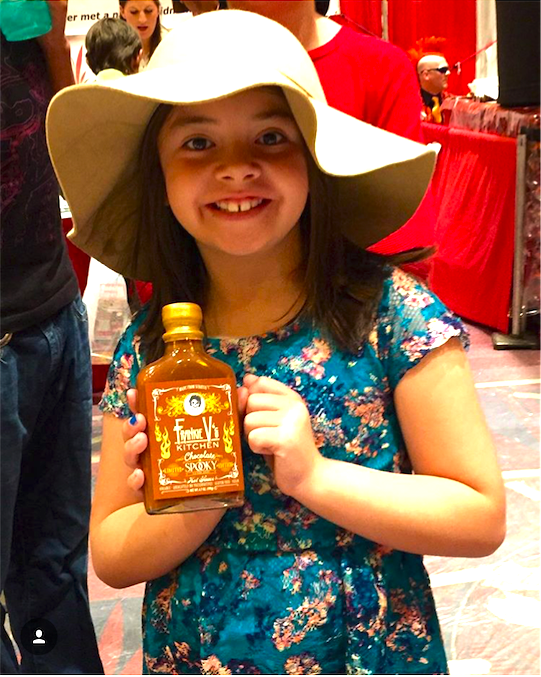 - A young chilehead with a bottle of hot sauce from Frankie V’s Kitchen.