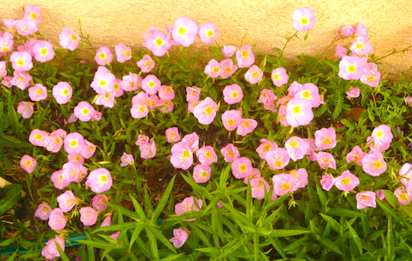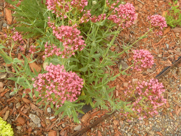 Pink flowers are all over our front yard, so I’m going to share them with you. Above, part of our hedge of Simplicity roses. This hedge will bloom again in the mid-fall. They are very easy to take care of and are pruned each spring with an electric pruning saw.