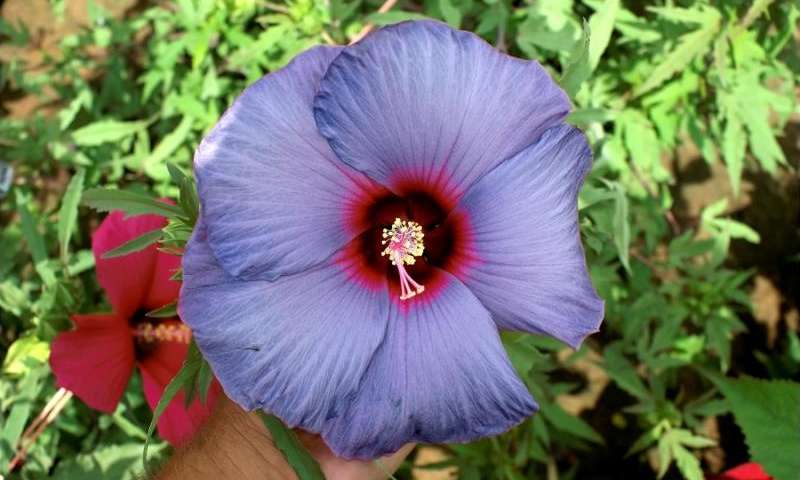 Above, the latest addition to our hibiscus collection, a hardy hibiscus called “Turn of the Century.” The blossoms have a seven-inch diameter. By “hardy,” they mean the opposite of tropical, and these can survive hard freezes. I ordered three plants from Jackson & Perkins in April, and two sprouted. Amazingly, they flower in about four months and keep flowering. I love hibiscus plants despite the fact that their blooms only last about 24 hours. We have two large pots of red, tropical hibiscus that we winter-over in the greenhouse. They are approaching 40 years old now, and still bloom like crazy all summer long–once they recover from their annual prune-back in May. Hibiscus are amazingly diverse. Here’s a gallery of four of them–out of seemingly hundreds.