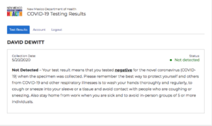 Last Wednesday, Mary Jane and I drove to a parking lot near downtown where Lovelace Hospital and TriCore Reference Laboratories had set up a drive-through Covid-19 Testing Line. We showed them our IDs and insurance cards, then proceeded to the nurses’ station. The nurse asked me, “Are you the guy who produces the Fiery Foods Show?” (This happens all the time.). I said, “One of them.” She said, “I love that show. Blow your nose and tilt your head back.” I complied and she stuck a swab 9 inches long up my right nostril and halfway to my brain. “That’s it,” she told me. “Your results will be ready in three days. Here’s the online link to check.” The procedure took 18 minutes.This morning I checked and this came up on the screen: